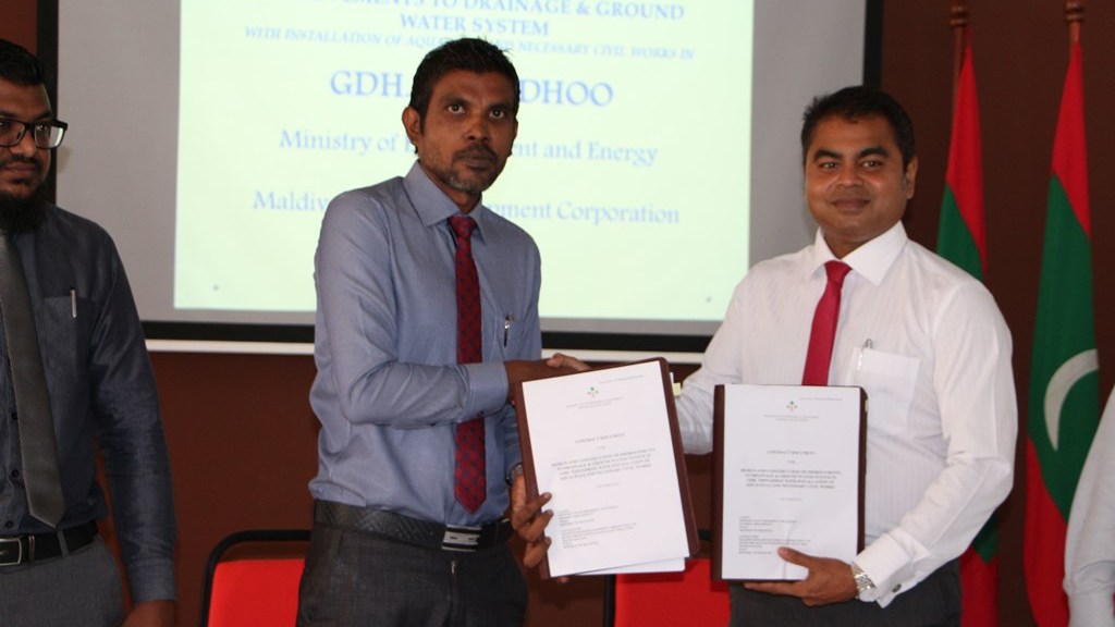 ގދ. ތިނަދޫގެ ސްޓޯމްވޯޓަރ މެނޭޖްމަންޓް ޕްރޮޖެކްޓުގެ ކޮންޓްރެކްޓުގައި މިއަދު ސޮއިކޮށްފިއެވެ. މި މަސައްކަތް ޙަވާލުކޮށްފައިވަނީ މޯލްޑިވްސް ރޯޑް ޑިވެލޮޕްމަންޓް ކޯޕަރޭޝަން (ޢެމް.އާރު.ޑީ.ސީ) އާއެވެ. މި އެއްބަސްވުމުގައި މިނިސްޓްރީގެ ފަރާތުން ސޮއިކުރެއްވީ މިނިސްޓަރ އޮފް އެންވަޔަރަންމަންޓް އެންޑް އެނަރޖީ، އަލްފާޟިލް ޠާރިޤް އިބްރާހީމެވެ. އަދި އެމް.އާރު.ޑީ.ސީ ގެ ފަރާތުން ސޮއިކުރެއްވީ އެ ކުންފުނީގެ ޑެޕިއުޓީ މެނޭޖިންގ ޑިރެކްޓަރ އަލްފާޟިލް އަހުމަދު މަމްދޫހެވެ.