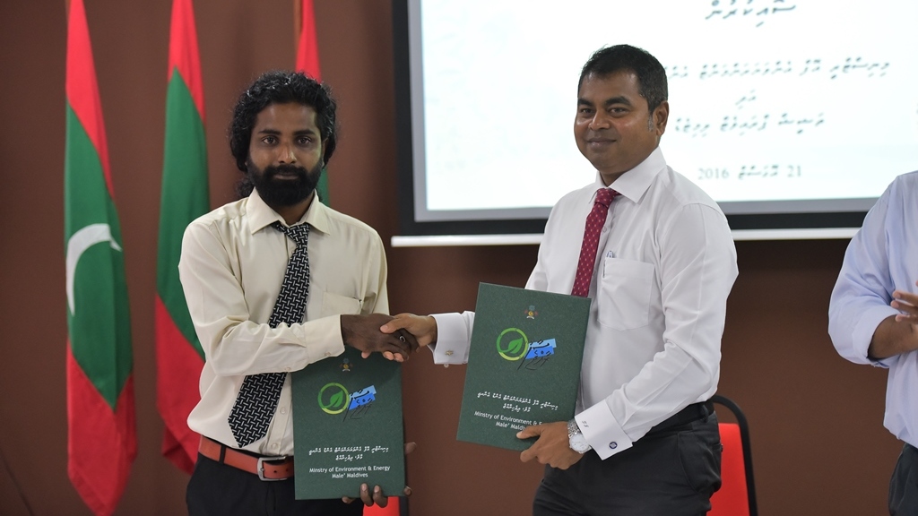 Contract signed to establish a Waste Management Centre in Raa atoll Fainu. This contract was awarded to Thashisha Private Limited. Minister Mr. Thoriq Ibrahim signed the contract while the Managing Director of Thashisha Private Limited, Mr. Ahmed Shazeen signed the contract on behalf of the company.