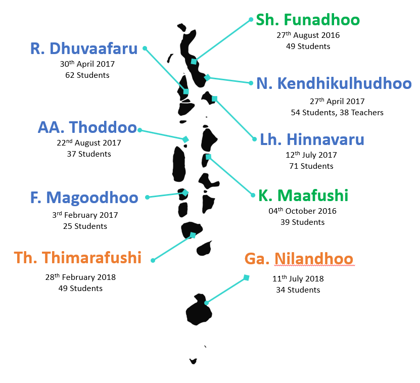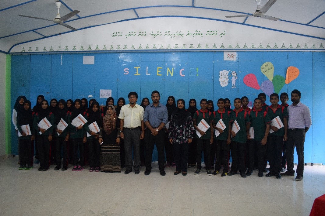 The workshops were tailor made for secondary school students, aimed at improving student’s knowledge on energy efficiency, also enabling them to raise awareness among their parents and families. The workshops were targeted towards 13 to 17-year-old students. In 3-year, period from 2016 to 2018 nine workshops was conducted to schools in 9 Atolls. A total of 420 students and 38 teachers participated in the workshops. 59% of the students were female and 42% were male students.